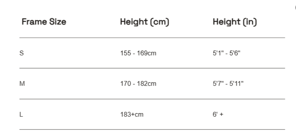 Frame size S (27 inch wheels): 156–170 cmFrame size M (29 inch wheels): 168–182 cmFrame size L (29 inch wheels): 180–194 cm