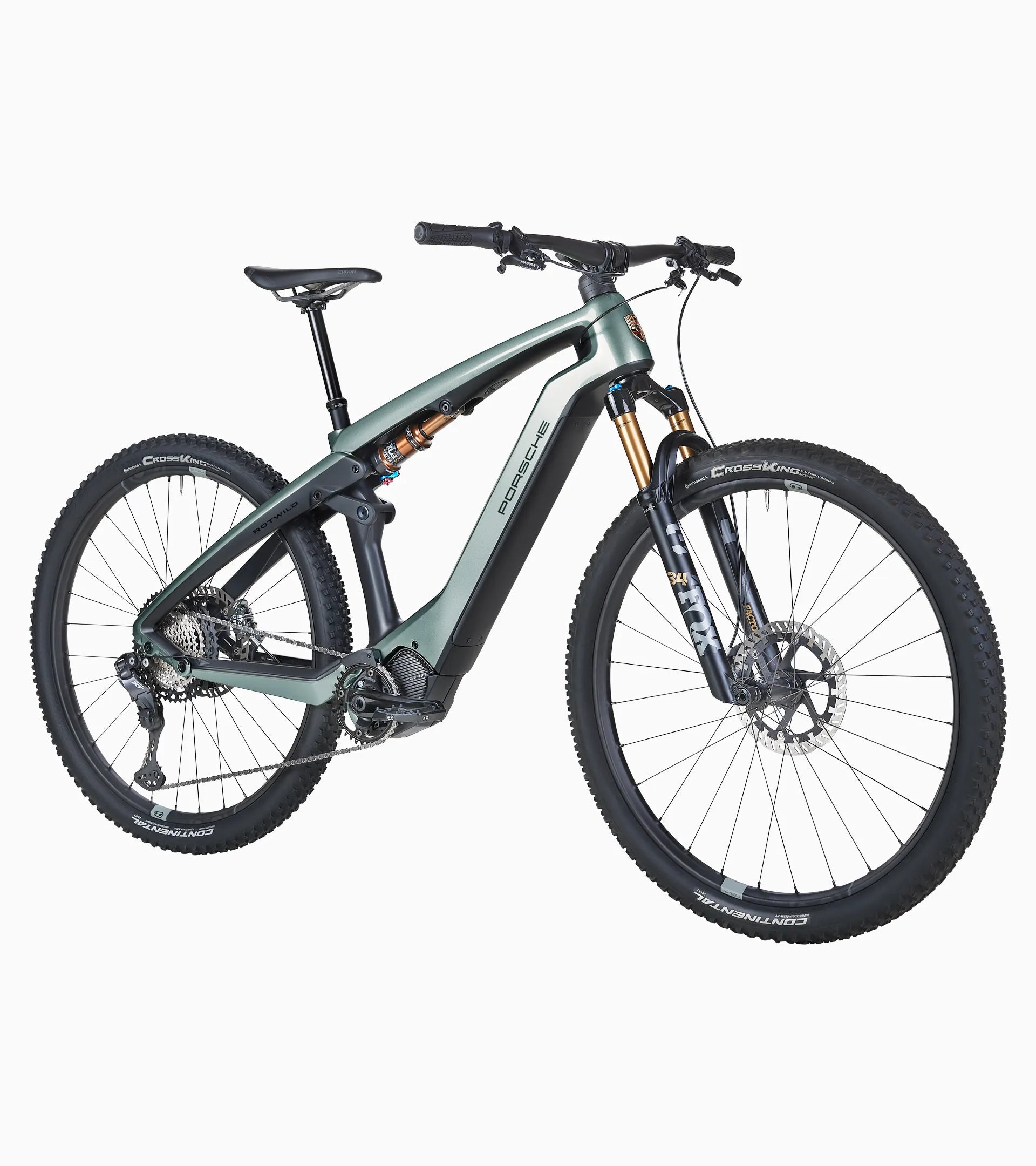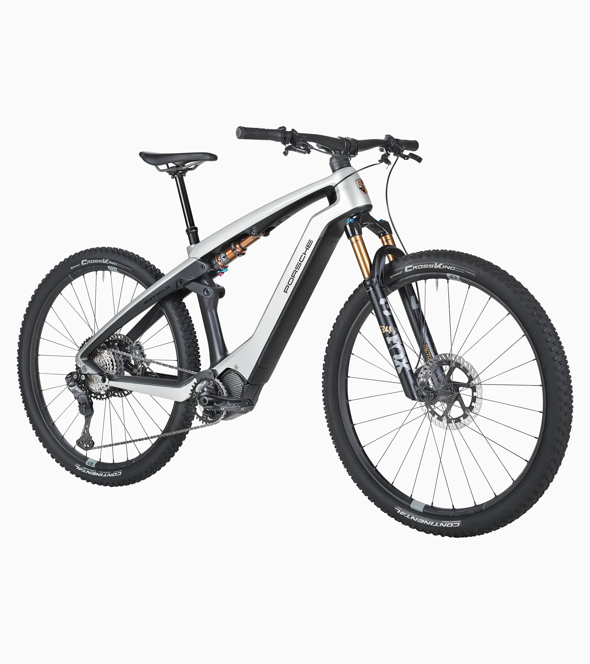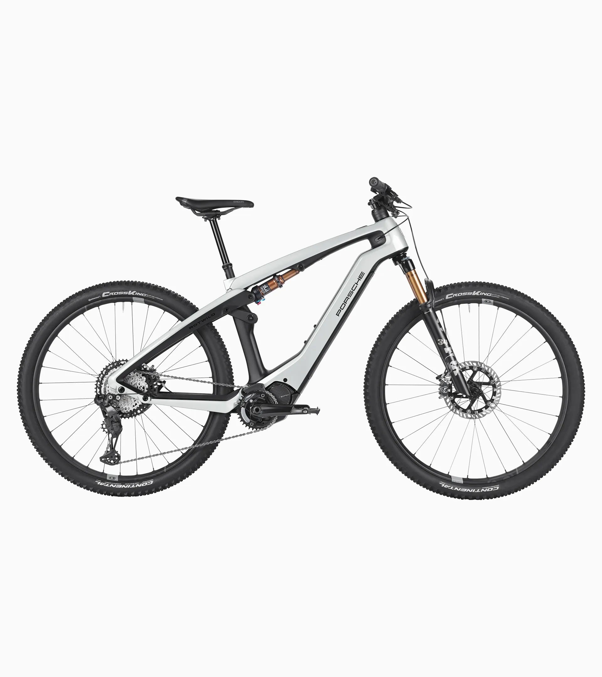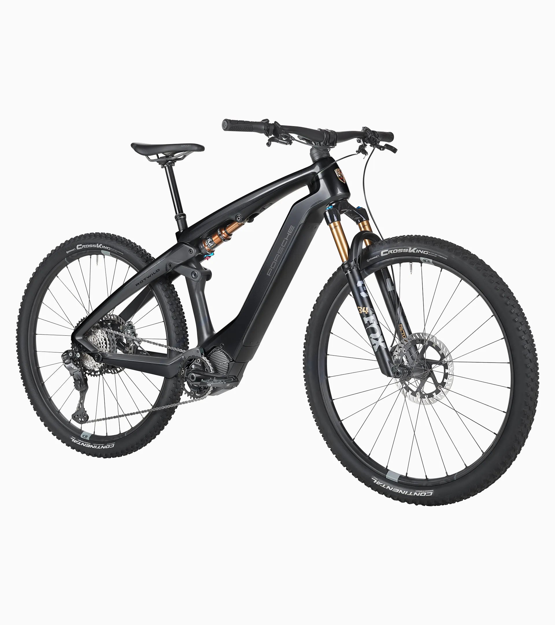 High-performance electric mountain bike from Porsche with weight-optimised carbon frame and handlebar, powerful Shimano motor and 630 Wh battery. Developed in cooperation with ROTWILD, frame design by Studio F. A. Porsche.