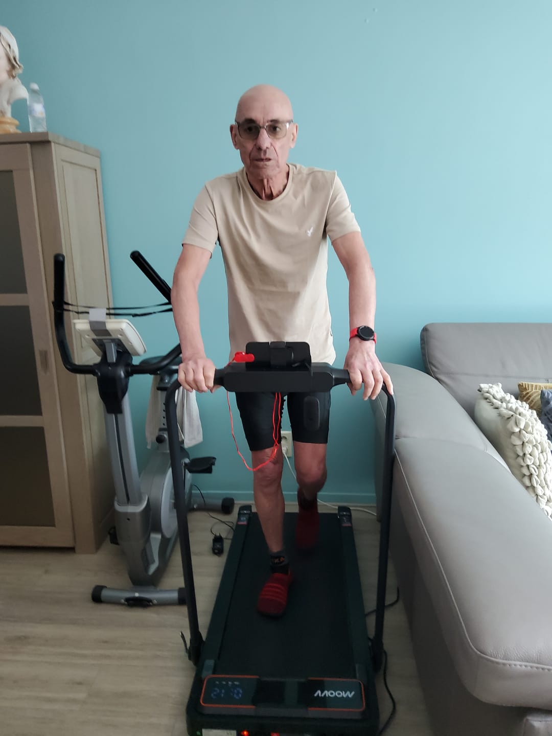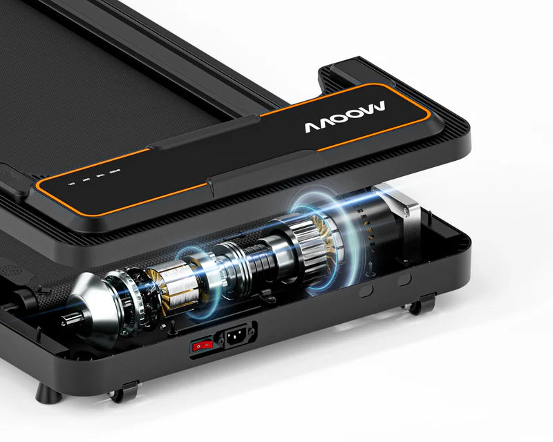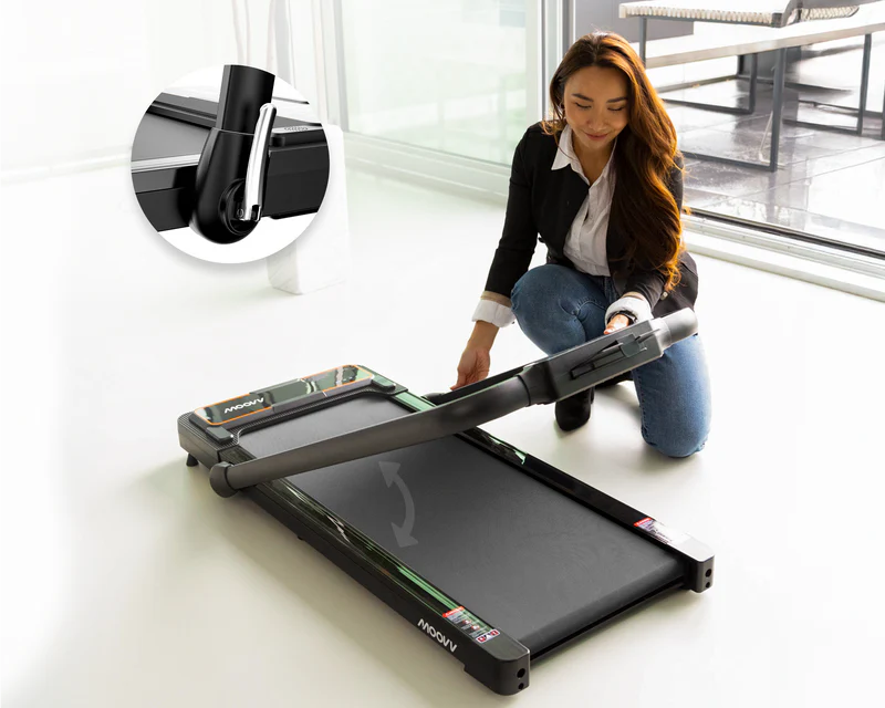 No bulky fitness equipment in your living room. The Moovv treadmill easily stores with its wheels on the bottom, directly under your sofa or bed.
