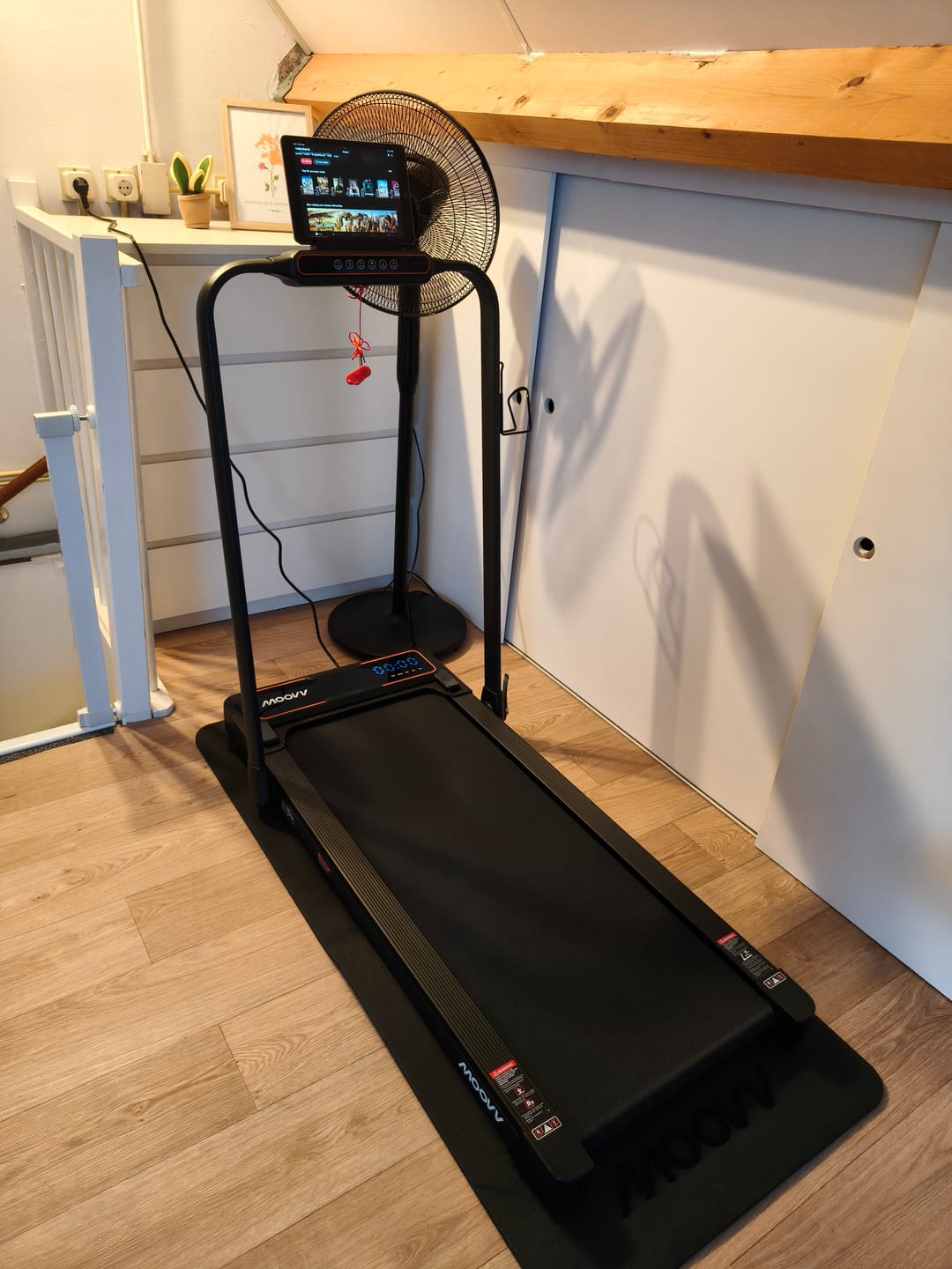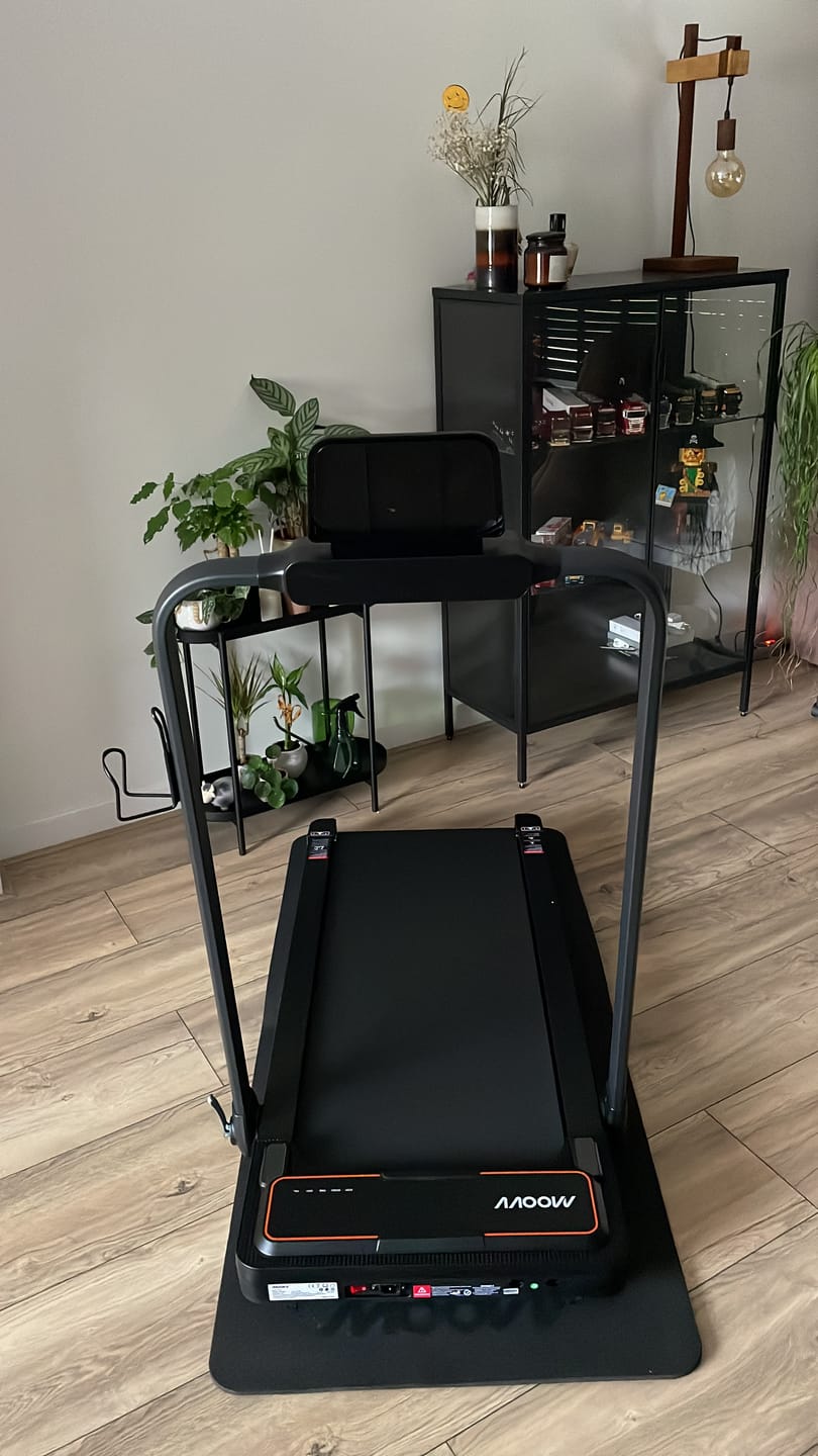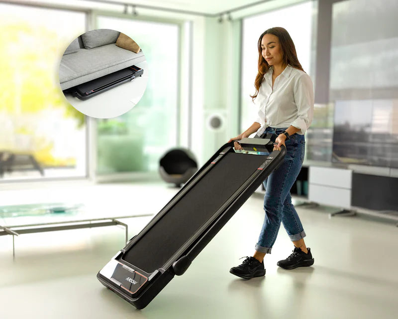 The treadmill is compact and easy to store under a bed or sofa thanks to its slim design.